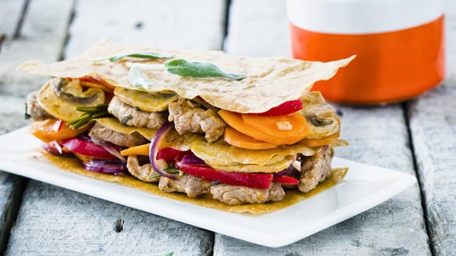 Monter les mille feuilles d'agneau : un morceau de feuille de brick, un peu de mélange à l'agneau et ainsi de suite sur trois couches.