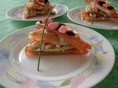 C'est un millefeuille fait avec des feuille de brick croustillante (passée 5mn au four) le melange est une purée d'avocat/échalote avec dès aux crevettes relevé d'un jus citron avec un décor oeufs de lump et un brin de ciboulette!