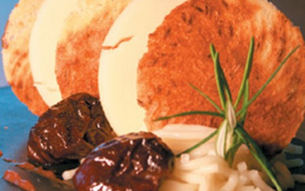 - Taillez de fines tranches de fromage Ossau-Iraty et avec la pointe d'un couteau, détaillez des disques de la même taille que les galettes croustillantes.