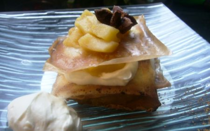 Sur une assiette à dessert, placez un carré de filo, une couche de mousse au chocolat, puis des pommes, un carré de filo, de la mousse, des pommes, ainsi de suite.