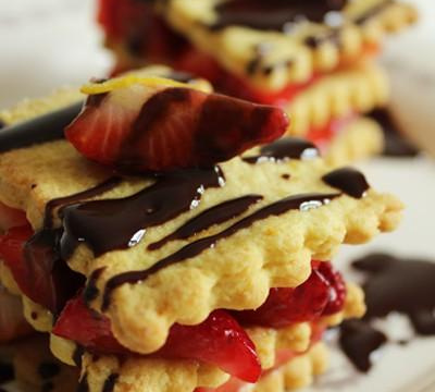 Disposer un sablé au citron, ajouter des quartiers de gariguettes au miel de garrigue ou d'accacia, renouveler l'opération et finir avec un sablé au citron. Déposer un quartier de gariguette et un filament de citron. A l'aide d'une cuillère à soupe, faire des va-et-viens sur les millefeuilles avec la sauce chocolat. Servir sans attendre.