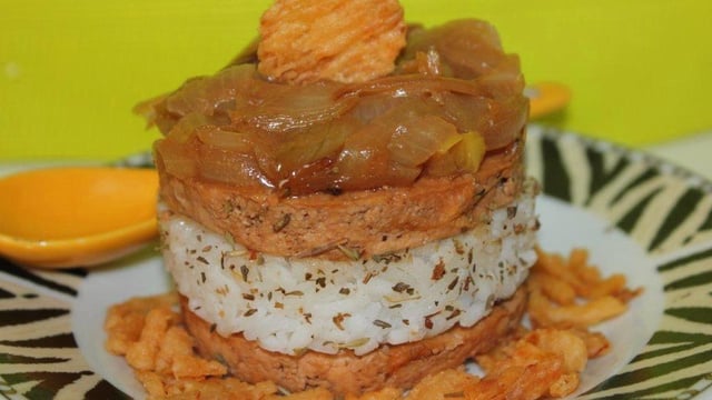 Montez le mille-feuille en commençant par le tofu, puis le riz, l'autre partie du tofu et terminez par l'oignon.