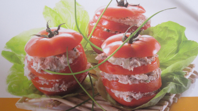 Dressez les mille-feuilles, tartinez les tranches de tomates de la préparation et empilez les tranches de tomate pour les reconstituer.