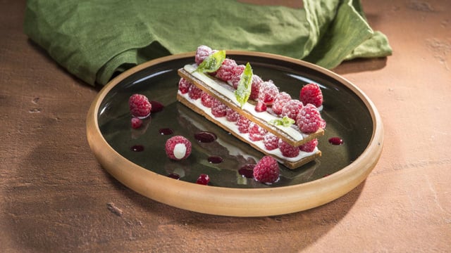 Le dressage, lavez et effeuillez la branche de basilic. A l'aide d'une poche à douille, injectez du coulis de framboise et de la crème vanille dans des framboises entières. Réservez. Étalez, sur un rectangle de pâte sur deux, la crème vanille. Disposez harmonieusement des framboises fraîches sur la crème, bien droites. Recouvrez des sablés natures, étalez de la crème vanille sur la moitié des sablés supérieurs, et des framboises sur l'autre moitié. Piquez quelques feuilles de basilic frais. Saupoudrez de sucre glace et dressez un millefeuille dans chaque assiette. Ajoutez les framboises farcies de crème vanille et des points de coulis de framboises.