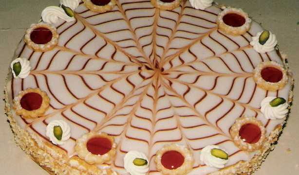 Étaler une fine couche de fondant blanc sur l'entremets - puis rapidement avec le cornet - dresser en partant du milieu une ligne en colimaçon - ensuite avec la pointe du couteau - faire des traits du milieu vers l'extérieur et vice versa - entre chaque entre deux (voir photo associée). - 4Finition :Masquer les cotés de crème - entourer d'amandes hachées grillées - saupoudrer les collerettes de sucre glace - les poser autour du mille feuille - les garnir de gelée de groseille - terminer avec pistaches et crème chantilly.