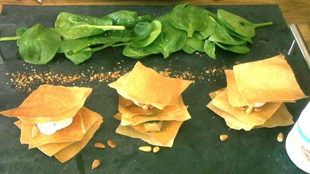 Disposez trois carrés de feuilles de brick dans chaque assiette et renouvelez l'opération. Posez un morceau de poire et quelques gouttes de coulis de menthe. Recouvrez de deux carrés de brick à chaque fois. A l'aide d'une poche à douille, faîtes un deuxième étage à votre mille-feuille en déposant délicatement une belle noix de mousse de chèvre (A défaut de poche, faîtes une quenelle avec une grande cuillère). Saupoudrez de piment d'espelette et de quelques pignons. Terminez vos minis mille-feuilles avec deux carrés de brick.