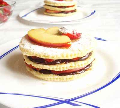 Monter les mille-feuilles sur les assiettes en déposant un rond de pâte feuilletée, napper de chocolat, ajouter les lamelles de nectarines puis disposer un 2 ème rond de pâte feuilletée. Napper de chocolat et des lamelles de fraises. Terminer par un 3 ème rond de feuilletage. garnir des restes des fruits et saupoudrer de sucre glace juste avant de servir.