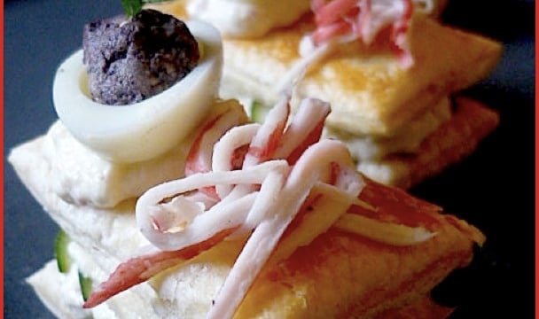 Sur la moitié des rectangles feuilletés, déposer deux tranches d'avocat, à la poche à douille couvrir d'une épaisseur de crème au surimi, déposer quelques semi-rondelles de concombre. Tasser délicatement à la spatule rectangulaire puis couvrir avec l'autre rectangle feuilleté.