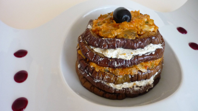 Une entrée toute en fraîcheur avec des rondelles d'aubergines et légumes confits, entre de la crème philadelphia ail et fines herbes.
