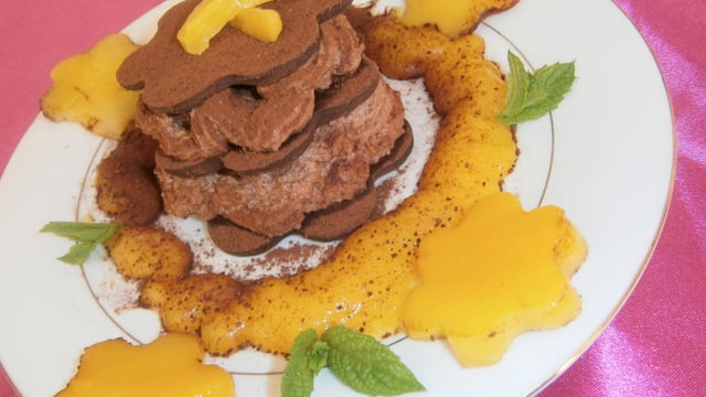 Entourer d'un cordon de coulis de mangue avec des morceaux de mangue. Saupoudrer de cacao tamisé à travers une petite passoire fine puis parsemer de pousses de menthe. C'est prêt!Excellente dégustation.