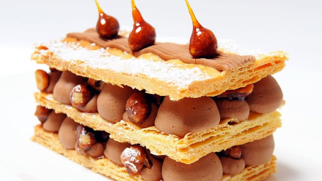 Une version audacieuse du millefeuille classique, avec une ganache chocolat-safran aux noisettes caramélisées.
