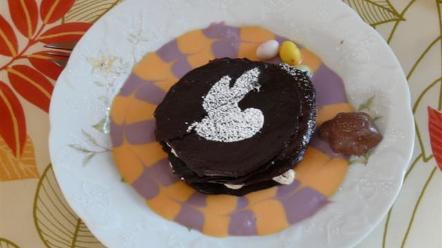 A l'aide de chablond (pochoir) rond, étalez la crème chocolatée sur des feuilles de silicones pour faire plusieurs croustillants (en compter entre 3 et 4 par personne).