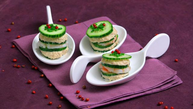 Couper une queue de gambas à moitié, dans le sens de la longueur, et disposer les deux moitiés à plat sur la deuxième tranche de concombre. Ajouter une nouvelle tranche de concombre généreusement tartinée avec les rillettes de thon.
