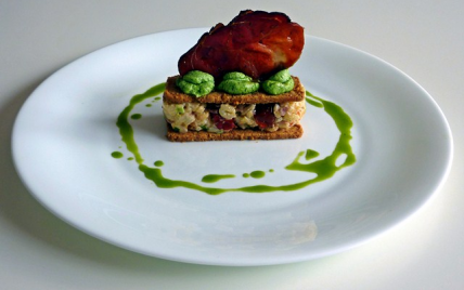 Faire des chips avec 2 tranches speck coupée en 2, enfourner 8 min à 180°C.