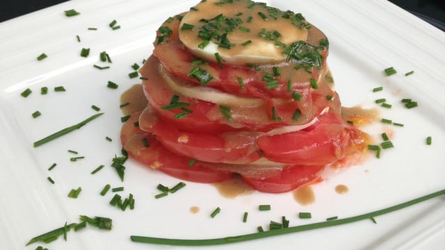 Parfait pour une entrée cet été, le mille-feuilles de tomate et sa mozzarella di buffala fumée !
