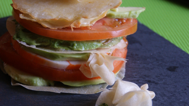 Dresser les mille-feuilles en suivant les étapes : 1 rond de brick, de l'avocat, du surimi, brick, avocat, tomate, surimi, et terminer par le biscuit à la Mayonnaise de Dijon® Amora. Renouveler l'opération pour la montage du 2ème mille-feuille.
