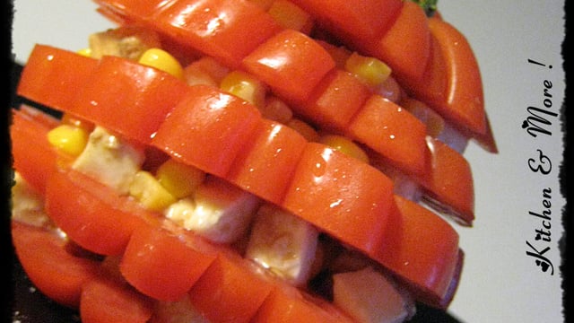 - 4Garnir les tomates de mozzarella, de maïs et de basilic.Alterner les couches pour former 2 mille-feuilles de tomates.