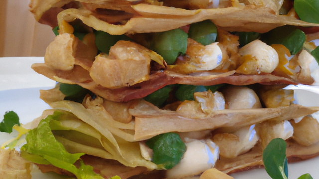 Prendre deux poivrons rouges et jaunes, trois belles courgettes, un haché de soja, de la crème fraîche épaisse et du gruyère, découper les poivrons en fine lamelle couper ensuite les courgettes en fines rondelles, faites les cuire dans une poêle avec un peu de beurre, laisser reposer sous cloche, préparer un plat a gratin mettre un peu de crème au fond, déposer une rangée de courgette intercaler une rangée de poivrons puis de courgette, étaler au dessus (1er etage) le haché de soja préalablement cuit, un peu de crème, puis nouvelle rangée de courgette poivrons (2eme etage) a nouveau de la crème, saupoudrer le toit de gruyère y mettre un peu de basilic ou autres herbes aromatiques au four pendant 10minutes prendre un emporte pièce rond et voila un délicieux mille-feuilles végétarien.