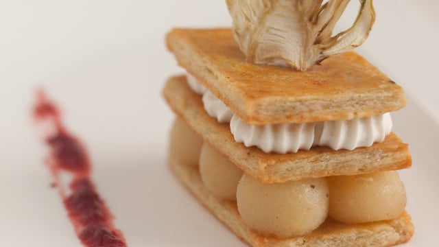 L'assocation poire-roquefort est revisitée sous forme de mille-feuille. On est entre la "poire & le fromage". La pâte est à base de roquefort, la crème est à base de ....... roquefort (il y en a qui suivent ), le tout accompagné de billes de poires pochées dans un blanc moelleux épicé.
