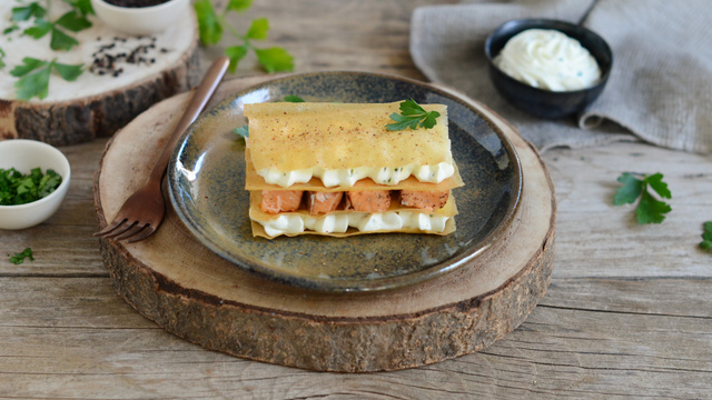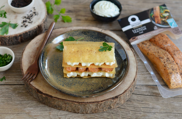 Un millefeuille salé à base de feuilles de brick, de saumon traiteur fumé aux 3 poivres et baie de Sichuan prêt à l'emploi et d'une texture moelleuse, le tout garni d'une crème au fromage frais et aux herbes. Un assemblage gourmand et croustillant pour un repas raffiné.