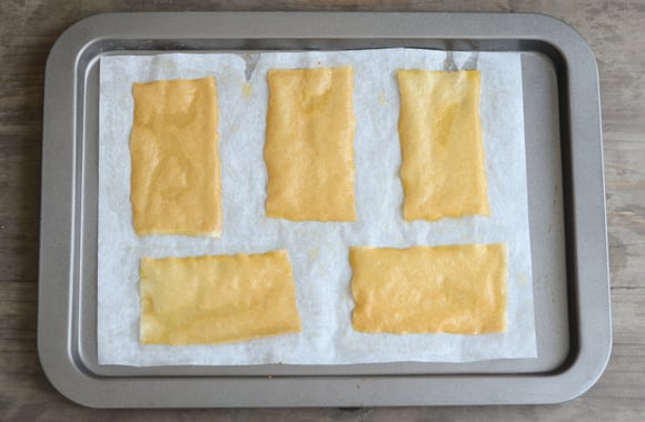 2Placez les rectangles de brick sur une plaque de cuisson recouverte de papier sulfurisé et badigeonnez-les de beurre fondu.