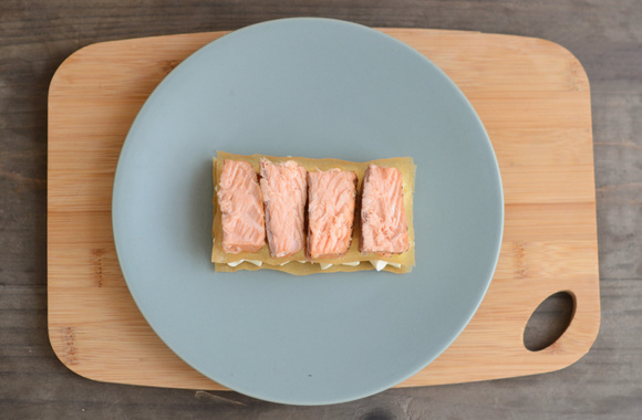 8Ajoutez par-dessus un rectangle de feuille de brick puis des tranches de saumon.