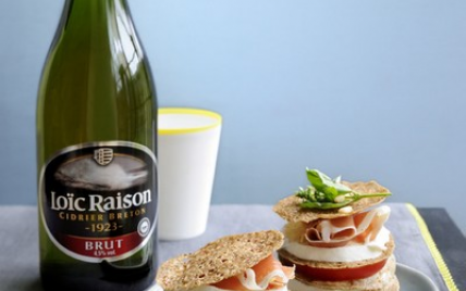 Terminez par un peu de jambon en chiffonnade et une galette croustillante. Donnez un tour de moulin à poivre à chaque étage du millefeuille. Ajoutez les pignons de pin et servez avec un peu de velours de balsamique et un filet d'huile d'olive. Servez accompagné de cidre LOÏC RAISON BRUT.