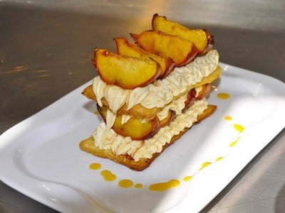 Montez le millefeuille en commençant par un rectangle de pâte, une couche de crème de mascarpone, puis des quartiers d'abricots, puis le rectangle de pâte. Faites deux niveaux.