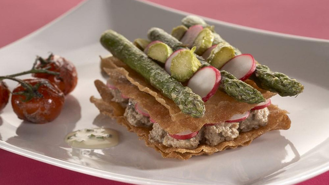 Un délicieux mille-feuilles d'asperges au caviar d'aubergines. Une recette originale.