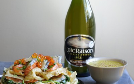 Recommencez une nouvelle fois ces 2 étapes et terminez en ajoutant des oeufs de saumon et de la ciboulette ciselée. Placez au froid. Servir accompagné de la vinaigrette orange/sésame et de cidre LOÏC RAISON TRADITIONNEL.