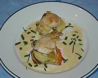 Constituez les millefeuilles directement sur les assiettes. Pour cela alternez des tranches assez épaisses de pomme de terre, les poireaux et les Saint-Jacques à la crème. (2 ou 3 tranches de pommes de terre suffisent par millefeuille).