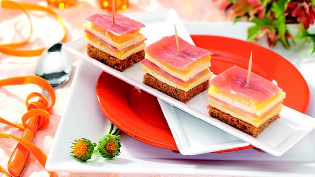 Superposez une tranche de Tomme de Savoie, de jambon, de mangue, de jambon et renouvelez l'opération.