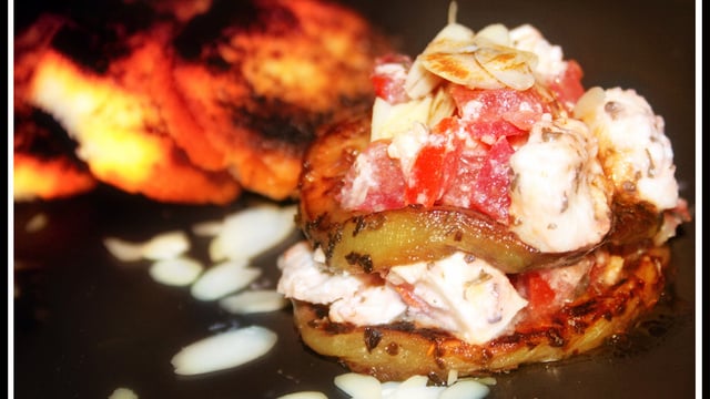 Disposer une tranche d'aubergine, puis une fine couche de tomates, puis des cubes de fromage.