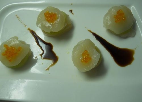 Monter chaque millefeuille en commençant par une tranche de saint-jacques, puis une tranche de kiwi, de nouveau une tranche de saint-jacques, une rondelle de concombre et surmonter de la saint-jacques. Garnir avec les oeufs de truite.