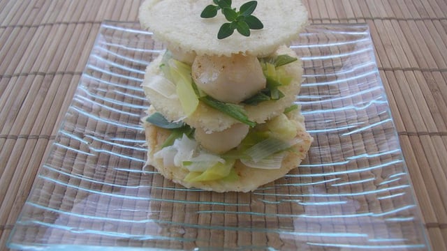 Dressez les millefeuilles : Posez une tuile sur chaque assiette, déposez des bâtonnets de poireaux puis 3 demies coquilles Saint-Jacques.
