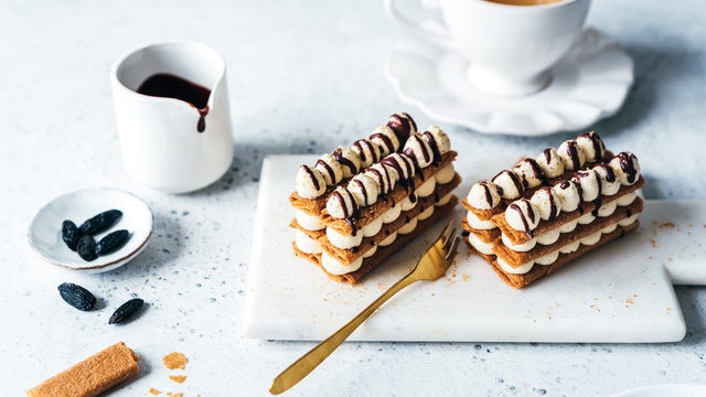 Millefeuilles ganache vanille-tonka aux crêpes dentelle nature.