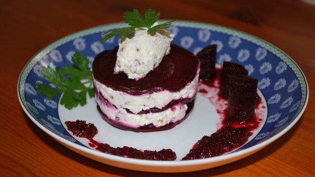 Dans des assiettes de service, déposez au fond d'un emporte-pièce de 7 cm, des rondelles de betterave puis une couche du mélange chèvre/petit-suisses, une de betterave, une autre de chèvre/petit-suisses, finir avec une couche de betterave.