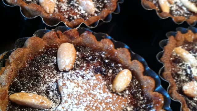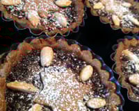 Abaisser la pâte sur un plan fariné, et tapisser 12 mini moules à tartes. Y étaler une cuillère à soupe de Mince Meat, parsemer des amandes effilées. Moi il ne m'en restait pas assez pour toutes, j'ai donc fait la moitié avec des amandes entières.