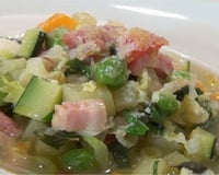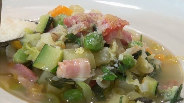 Le minestrone est une soupe de légumes mijotés avec du lard, des herbes et des pâtes, une soupe pleine de saveurs, complète à partager.