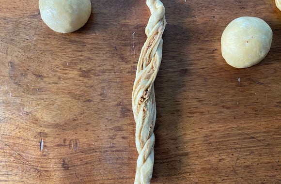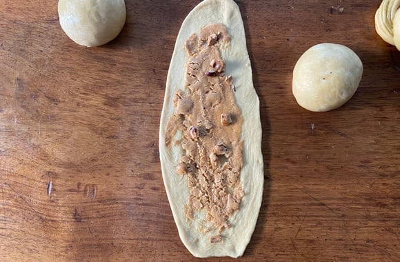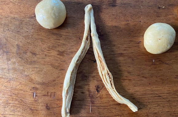 5Roulez la pâte dans le sens de la longueur. Formez un long boudin puis à l’aide d’un couteau coupez le boudin en deux.