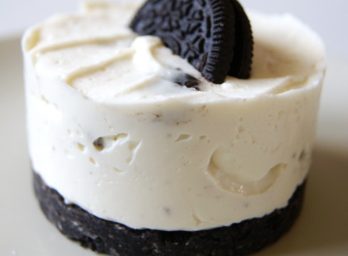 Pour la déco, ajouter 1/2 Oréo sur le dessus de chaque cercle. Faire prendre au réfrigérateur au moins 2 heures, au préférable toute une nuit.