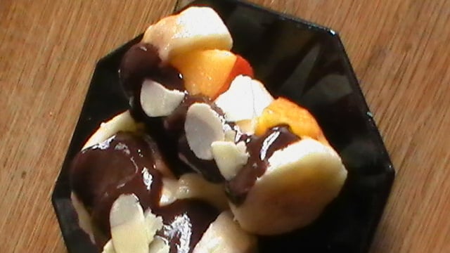 Confectionner les minis brochettes, ajouter le chocolat et les amandes.