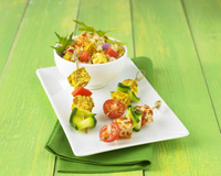 Faire cuire les lamelles de courgettes à la vapeur 3 minutes. Sur un pic en bois, enfiler les ingrédients en alternant Tofou' cubes, tomates et courgettes.