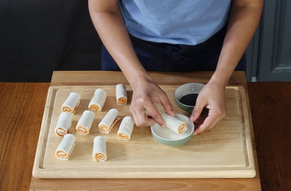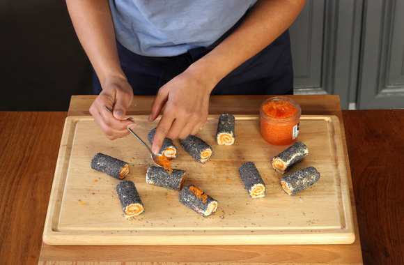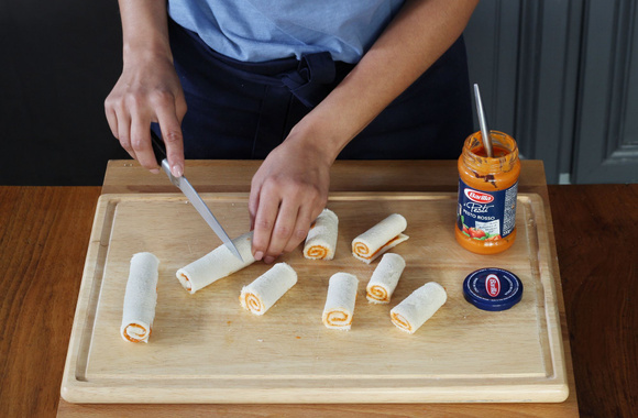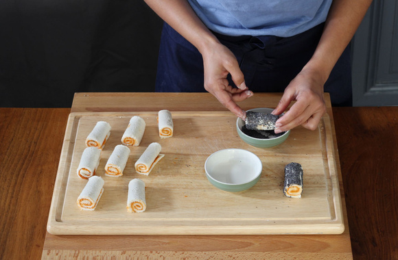 5Découpez les roulades à moitié, afin d'en obtenir de plus petites.