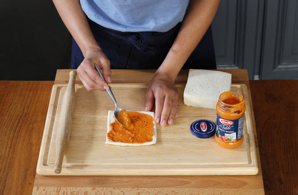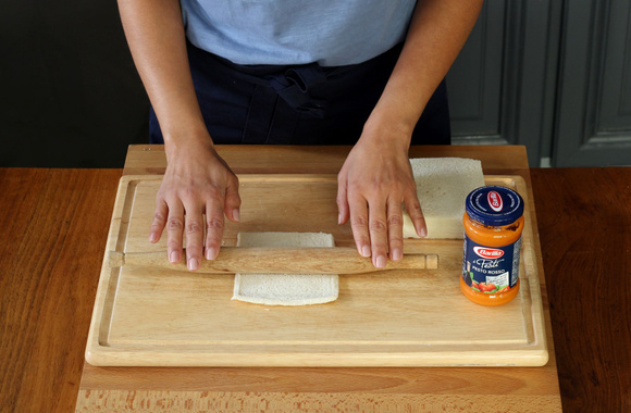 2A l'aide d'un rouleau à pâtisserie, applatissez chaque tranche de pain de mie.