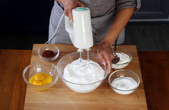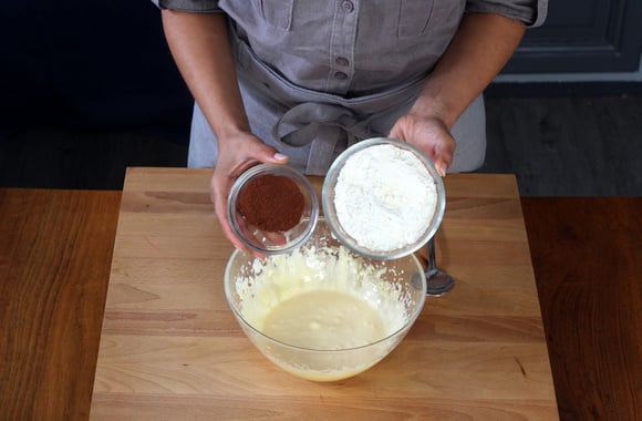 4Incorporez la farine, le cacao et la levure. Mélangez.