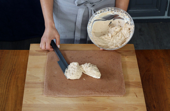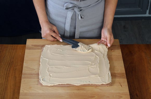 13Tartinez la génoise de la moitié de la crème à la pralinoise.
