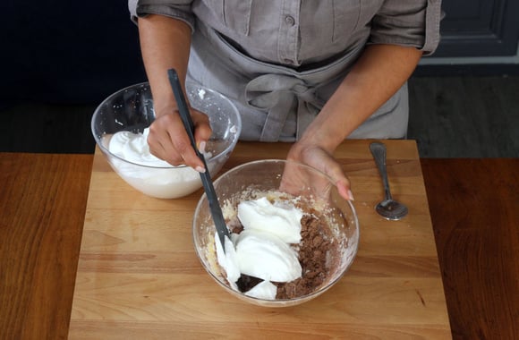 5Ajoutez délicatement les blancs en neige au mélange de jaunes d'oeufs et farine.