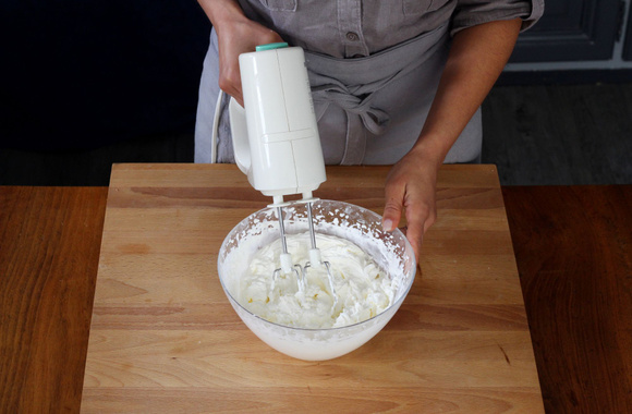 9Mettez la crème liquide froide et le mascarpone dans un saladier puis montez-les en chantilly à l'aide d'un fouet électrique.