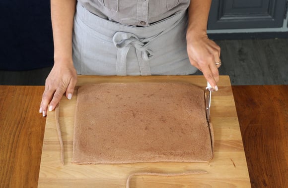 Une fois cuite, retournée la génoise sur un torchon humidifié. Enlevez le papier sulfurisé, laissez refroidir, puis ébarbez les bords afin d'obtenir un rectangle uniforme.